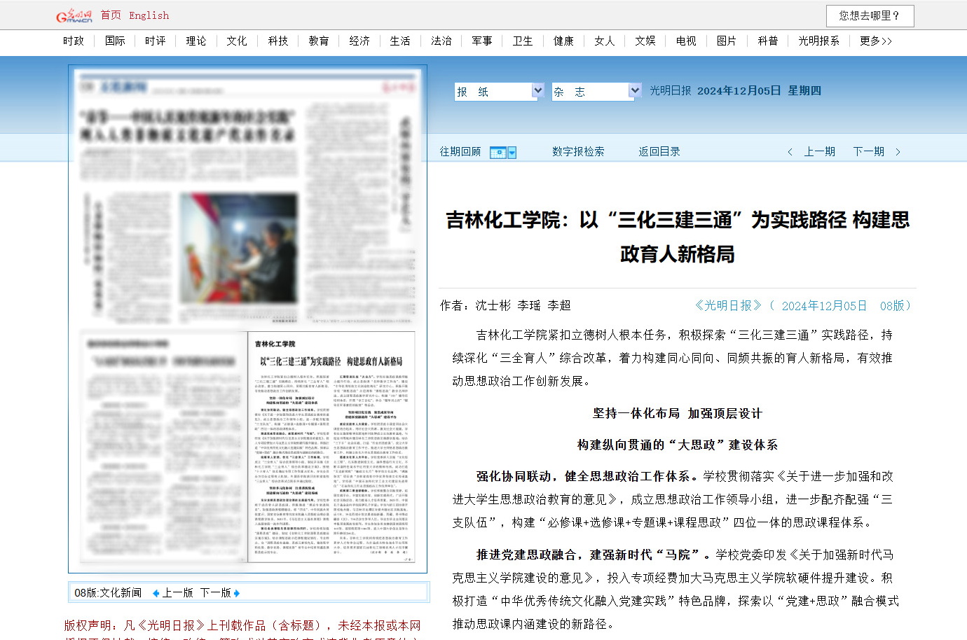 2024年12月5日,《光明日报》文化新闻版面,以《吉林化工学院:以“三化三建三通”为实践路径 构建思政育人新格局》为题,从“坚持一体化布局,加强顶层设计构建纵向贯通的‘大思政’建设体系;坚持多元化协同,注重系统集成组建横向互通的‘大思政’建设场域;坚持项目化实践,聚焦成果导向搭建深度融通的‘大思政’建设平台”三个方面,报道我校积极探索“三化三建三通”实践路径,持续深化“三全育人”综合改革采取的举措及取得的成效。